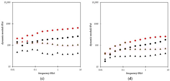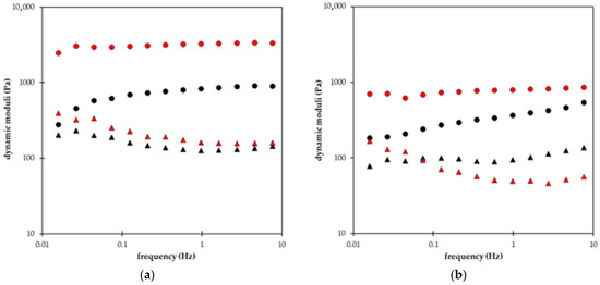 Figure 8. Storage modulus G′ (circles) and loss modulus G″ (triangles) in the dependence of frequency. Comparison of different NPK contents without LH (a): samples A (black) and B (red). Comparison of different NPK contents with LH (b): samples C (black) and D (red). Effect of AM addition to polymers containing NPK and LH (c): samples E (black) and F (red). Effect of AM addition to polymers containing LH without NPK (d): samples G (black) and H (red).