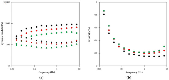 Figure 9. Time stability of sample A: Storage modulus G′ (circles) and loss modulus G″ (triangles) measured for sample A (a) and the ratio G″/G′ (b): after 24 h (black), 5 weeks (red), and 1 year (green).
