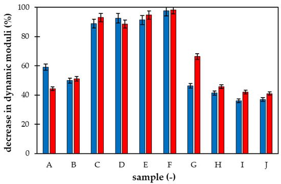 Figure 11. The average decrease in storage modulus (blue) and loss modulus (red) after 1 year. Samples A and B contain only NPK, C, D, E, and F combination of NPK and LH, G and H only LH. Samples I and J are without nutrients. AM was added to samples E, F, G, and J.