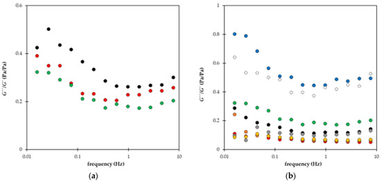 Figure 10. The ratio between loss and storage modulus after 24 h (a) and 1 year (b): samples A (black), B (red), C (green), D (orange), E (grey), F (yellow), G (blue), and H (white).