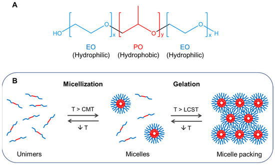The basic requirements of in situ gelling systems for local administration are injectability and gelation under physiological conditions. Therefore, in addition to allowing the incorporation of therapeutic agents, thermoresponsive polymer solutions should have low viscosity to flow easily during administration and rapidly form a gel once injected [1]. Although other in situ-forming thermoresponsive hydrogels based on chitosan [10,11], polyacrylamides [12], and polyesters [13,14] have been developed for this purpose, poloxamers have gained significant attention from researchers over the past two decades.