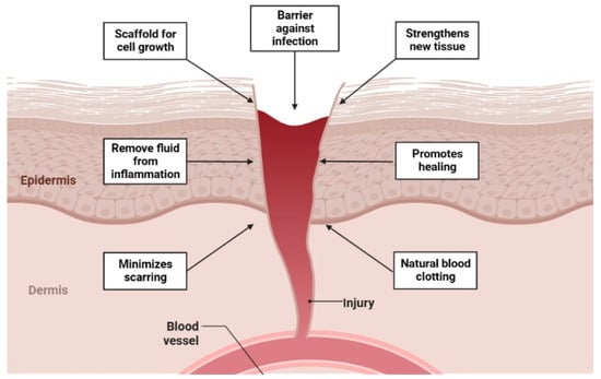 The skin protects against the loss of internal substances and external stimuli, including microbial invasion, as the largest and most vulnerable organ in the human body (Figure 1). The epidermis, which is the outermost layer; the dermis, which is located beneath the epidermis and primarily made up of connective tissues; and the hypodermis, which is deeper subcutaneous tissue made up of connective and adipose tissues, make up the three main layers that make up the skin [,,]. The body’s largest organ, the skin, acts as the body’s primary defense against external dangers and as the first line of defense. The epidermis, dermis, and hypodermis comprise its three principal layers []. The outermost layer, the epidermis, acts as a protective shield. It consists of multiple layers of cells, with the outermost layer constantly shedding dead skin cells.