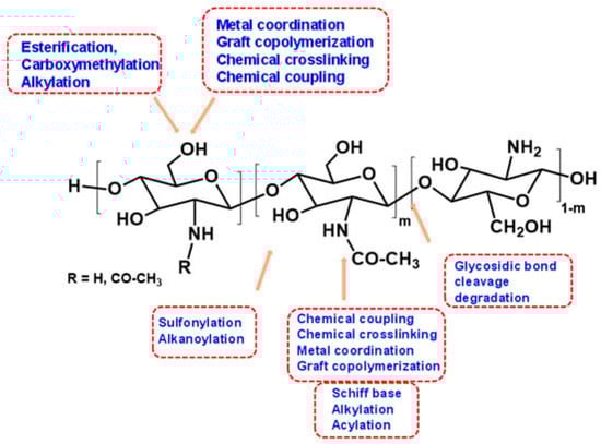Functional groups in chitosan polymer that can be chemically modified. Reproduced with permission under CC BY 4.0 license [].