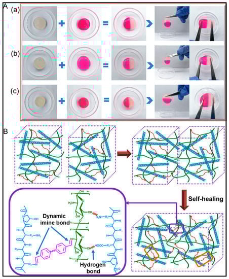 Illustration of Cut–Heal properties of the hydrogel obtained from collagen–chitosan at a ratio of (a) 1/1, (b) 1/2, and (c) chitosan alone (A). Systemic representation of self-healing mechanisms showing hydrogen bond and imine bond formation (B). Reproduced with permission from [] under Copyright 2020, American Chemical Society.