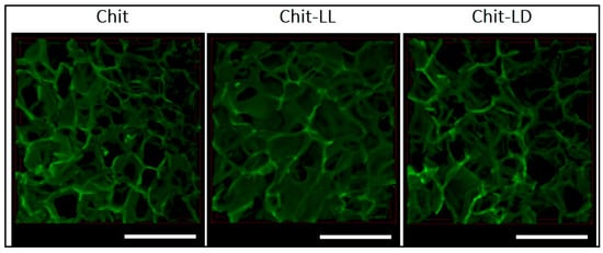 CLSM images of the 3D macroporous hydrogel samples produced from chitosan (Chit) and two co-polymers: chitosan-g-oligo (L, L-lactide) (Chit-LL) and chitosan-g-oligo (L, D-lactide) (Chit-LD). Reproduced with permission under CC BY 4.0 license [].