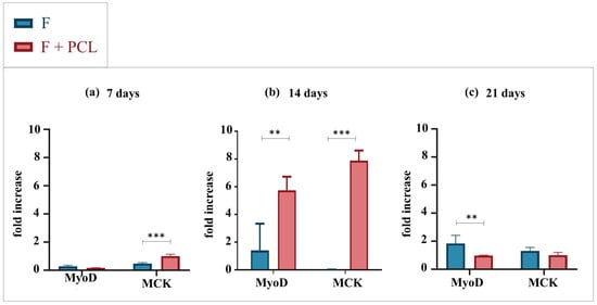 Gene expression analyses were performed at 7, 14, and 21 days of culture in differentiative conditions (Figure 1). The bioprinted constructs are named F, which stands for fibrinogen-based hydrogel, while the co-printed structures are named F + PCL, as the same hydrogel has been deposited on a PCL support. RT-qPCR was used to detect expression levels of myogenic genes in 3D structures; in particular, since there are first preliminary tests, we only considered the two muscle master genes, i.e., MyoD and MCK, normalized by the housekeeping PGK gene (Table S1). At 7 days, the MCK gene was significantly expressed by cells cultured in the co-printed linear structures (Figure 1a). At 14 days co-printing significantly improves the differentiation, showing high expression levels of both MyoD and MCK genes. At 21 days, no statistically significant differences in MCK expression were found; however, MyoD was differentially expressed in the bioprinted structures, showing a still early differentiation. Overall, at 21 days, MyoD gene expression decreased significantly; as expected, the expression of this gene is related to early myogenic differentiation, while, after 21 days of culture, the decreases are in favor of the expression of late genes involved in the myogenic commitment and cell elongation. These data show that the co-printing process significantly improves cell differentiation, in particular at 14 days. For this reason, all the 3D structures that will be examined below in the discussion have been created through 3D co-printing.