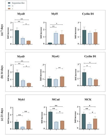 At 7 days, no statistically significant differences are observed in the expression levels of the Cyclin D1 gene; all structures provide the same proliferative stimulus. The MyoD gene is differentially expressed in the serpentine-like structure compared to the circular ones. Otherwise, the Myf5 gene is differentially expressed in circular structures compared to the serpentine-like one.