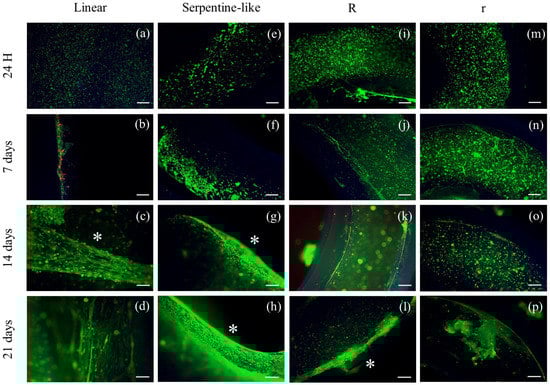 Live (green)/dead (red) images of different 3D geometries at specific time points in differentiative conditions. (a–d) Linear 3D constructs; (e–h) serpentine-like 3D constructs; (i–l) circular 3D constructs with OD 10 mm; (m–p) circular 3D constructs with OD 5 mm. Scale bar 50 μm. * highlights cell elongation. R indicates structures with a 10 mm outer diameter, while r indicates those with a 5 mm outer diameter.
