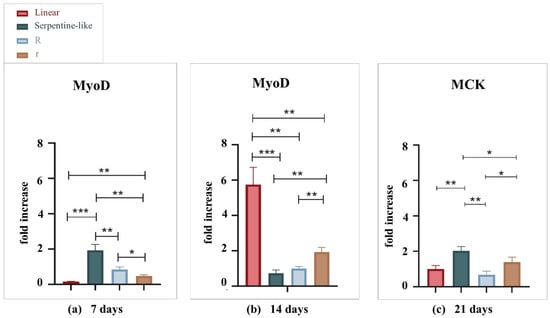 Gene expression analysis of C2C12 cultured into the different geometries tested (linear, serpentine-like, and circular) at 7, 14, and 21 days. (a) MyoD expression by qRT-PCR at 7 days. (b) MyoD expression by qRT-PCR at 14 days. (c) MCK expression by qRT-PCR at 21 days. Results are normalized to the housekeeping gene (3-phosphate dehydrogenase [PGK]). Statistically significant values are indicated as * p < 0.05, ** p < 0.01, and *** p < 0.001. Analysis of variance test was performed to evaluate data significance. R indicates structures with a 10 mm outer diameter while r indicates those with a 5 mm outer diameter.