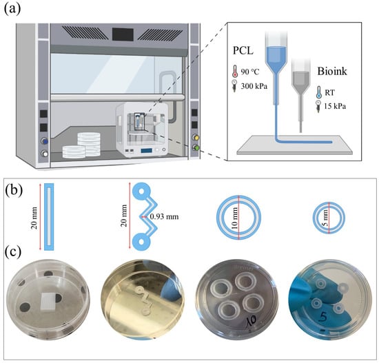 Design and fabrication of the different 3D constructs used in the study—linear, hybrid, and circular with different outer diameters (OD 10 mm, OD 5 mm). (a) Illustration showing the biofabrication process, selected materials, and printing parameters. (b) Schematic representation of the structures CAD design. (c) 3D-printed PCL constructs.