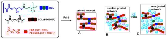 Figure 1 schematically shows the strategy used in this work as well as the structures of the components of the formulation. Three-dimensional printing via vat photopolymerization renders type A networks, which have a crosslinking density defined by the sum of the stable crosslinker, SCL, and the hydrolysable crosslinker, HCL. This A network, before any swelling readjusting, is capable of uptaking some amount of water to become a type B network. B networks are then capable of readjusting their swelling upon selective hydrolysis of the hydrolysable crosslinking agents to give rise to C, with network C being the network with the maximum readjustment in swelling (only the permanent crosslinking agents ensure the hydrogel’s integrity). Thus, the adjustable network design is based on the simultaneous use of the SCL and HCL. In this way, the adjustable character of hydrogels refers to the ability to modulate the degree of swelling, starting from an initial value (network B in the Figure 1), through the controlled hydrolysis of the HCL bridges. The final (and maximum) swelling is defined by the residual SCL bridges (after hydrolysis of all the HCL; network C in the Figure 1).