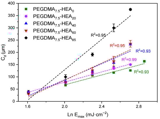 Working curves for the PEGDMA7.5-HEAy series when exposed to 405 nm light (0.5 mW·cm−2). Data correspond to (from right to left in each group of data) exposure times of 35, 30, 25, 20, 15 and 10 s. Linear regressions are included.