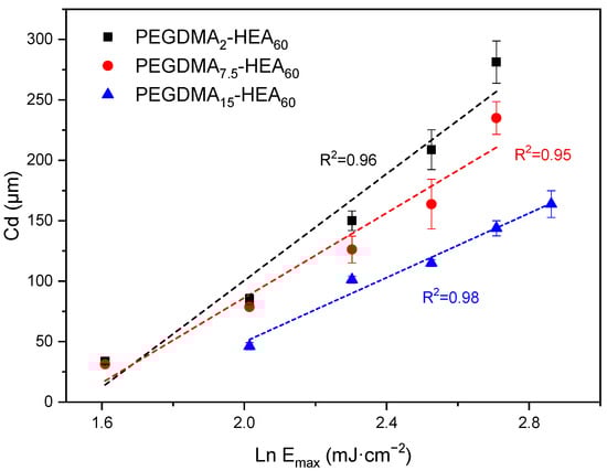 where Emax (mJ·cm−2) is given by the product of the exposure time and the energy of the lamp (0.5 mW·cm−2 in the Zortrax Inkspire 3D printer). Ec (mJ·cm−2) is the starting point for the transition from liquid to solid and Dp (μm) represents the penetration depth. Bearing in mind the properties of the 3D printed objects, it is necessary to obtain good adhesion between the layers. To achieve this, the use of layers with sufficient depth is essential, i.e., Cd > z, in our case Z = 100, because the stiffness of a polymer at the gel point (or below it) is too low to endure the printing process [,,]. This expression equates to a linear line on a semilogarithmic plot of Cd on the y-axis versus Emax on the x-axis. The interception of the Jacobs working curve with the x-axis represents Ec, whereas Dp is the slope of the linear line.