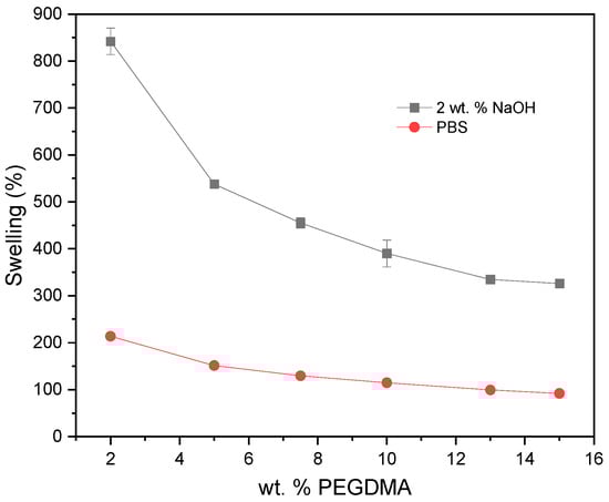 The pieces were immersed either in PBS or in basic water (2 wt. % of NaOH) and gravimetrically monitored to determine their water content and calculate the corresponding swelling according to Equation (1). In PBS, a gradual increase in swelling was observed until reaching an equilibrium value varying in the 100–170% swelling range, depending on the composition. This equilibrium value, which is reached between 24 and 96 h (depending on the system), is plotted in Figure 3. Interestingly, although the crosslinking density decreases with an increasing HEA content, this does not translate into a correlative increase in swelling. Swelling increases slightly up to 40 wt. % HEA but then decreases, remaining in all cases above 100%. To the naked eye, it is observed that very HEA-rich hydrogels have a transparent outer layer and a colored core, which is probably slightly swollen. This behavior can be as explained follows. With an increasing HEA content, on the one hand, there is initially a slight increase in swelling in PBS due to the significant decrease in the molar percent crosslinking. From 40%, on the other hand, these variations in the degree of crosslinking are not as high, and swelling decreases due to the greater water absorption capacity of PEGMA-based systems compared to HEA-based systems for similar degrees of crosslinking [,,].