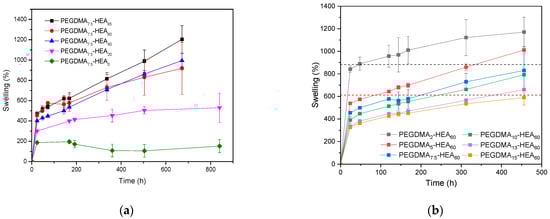 Swelling vs. time (from 1 h up to 20 days) in water with 2 wt. % NaOH for the PEGDMA7.5-HEAy (a) and PEGDMAy-HEA60 (b) series.