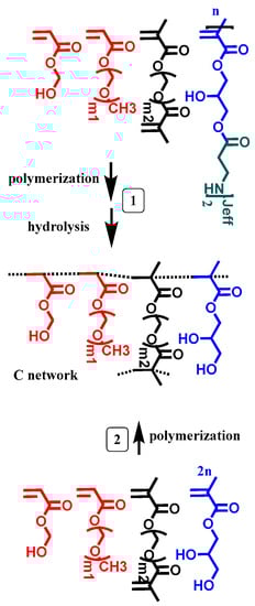 1: Scheme of the polymerization and hydrolysis of the PEGDMAy-HEA60 series. 2: Scheme of the preparation of reference structures carrying GMM. The jeff tag refers to the spacer of the Jeffamine (R of H2N-R-NH2).