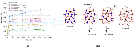 Figure 8 shows that in PBS the equilibrium swelling value is reached after about 24 h and remains constant for weeks. This would be the swelling of the type B network. Networks with structures and swellings between network B and network C can be obtained via immersion in pH 10 for a selected time to allow partial hydrolysis of the β-aminoesters, followed by the stabilization of the structure via immersion in PBS, as shown in the diagram of Figure 8. This strategy was carried out via immersion in pH 10 for 17 and 25 h, followed by stabilization in PBS. These curves are represented in Figure 8 and show that it is possible to modulate the swelling between the two networks, B and C.