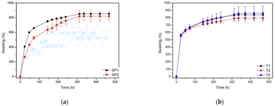 Spheres SP1 and SP2 reached equilibrium swelling values after being immersed in PBS for 48 h, with values close to 150. In a basic medium, i.e., pH 10 buffer, they showed a continuous increase in swelling up to approximately 300 h, with the kinetics of the larger sphere being slower than those of the smaller sphere (see Figure 9a). The tubes displayed a similar behavior (Figure 9b). It must be taken into account that these pieces, especially the spheres, have larger dimensions than the pieces studied in Figure 8, which reached equilibrium within less than 100 h.