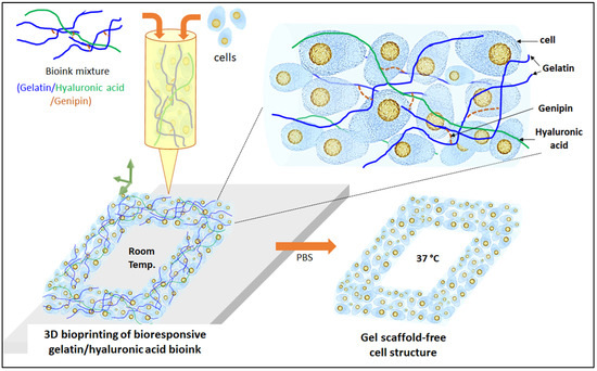 Scheme of 3D bioprinting with bioresponsive gelatin-hyaluronic acid hydrogel.