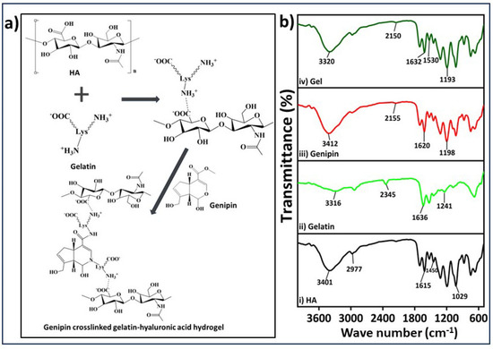 (a) Proposed reaction mechanism of the gelatin-HA gel formation with genipin, (b) FTIR analysis of hyaluronic acid (HA); gelatin, genipin, and gel (i, ii, iii, iv respectively).