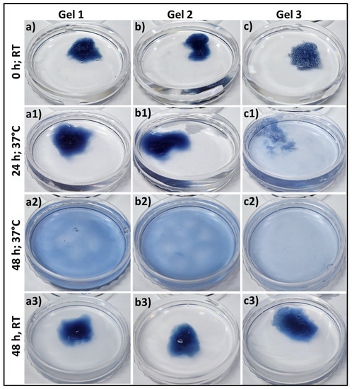 Swelling & degradation study of different gelatin-HA hydrogels at 37 °C and room temperature (25 °C) into phosphate buffer, pH 7.4 for 48 h. (a–c,a1–c1,a2–c2) at 37 °C; (a3–c3) at room temperature after 48 h.