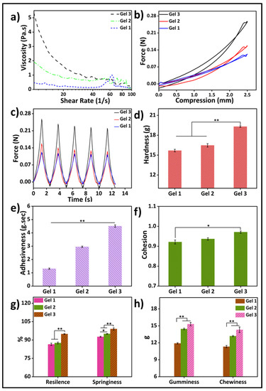 (a) Rheological properties of three different gelatin-HA hydrogels; Cyclic compressive response of the hydrogels (b) with compression; (c) with time; Mechanical properties of three different hydrogels (d) Hardness; (e) Adhesiveness; (f) Cohesion; (g) Resilience & Springiness; (h) Gumminess & Chewiness. Results differences are considered statistically significant when p ≤ 0.05 (*) and p ≤ 0.01 (**).