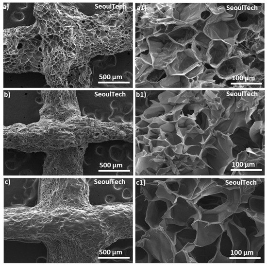 SEM images of the surface and cross-section of the three different gelatin-HA hydrogels. Surface and cross-section images of Gel 1 (a,a1), Gel 2 (b,b1), and Gel 3 (c,c1), respectively.
