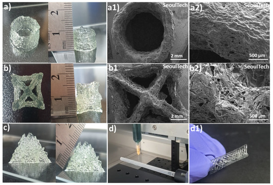 3D and four-axis printing of complex structures with gelatin-HA gel. (a,a1,a2) Digital and SEM images of Hollow tube; (b,b1,b2) Digital and SEM images of Star shape; (c) Pyramid shape; (d,d1) Four-axis printed tubular shape.