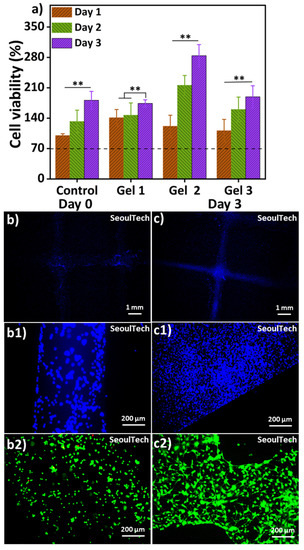 (a) MTT assay of three different conditions hydrogel; (b,c) DAPI staining low magnification images at day 0 and day3; (b1,c1) DAPI staining high magnification images at day 0 and day 3; (b2,c2) Live and Dead (L&D) staining using Max-viewTM Live/Dead cell staining kit (Biomax, Guri, Republic of Korea) high magnification images at day 0 & day 3, where green represents live cells and red represents dead cells. Results differences are considered statistically significant when p ≤ 0.01 (**).