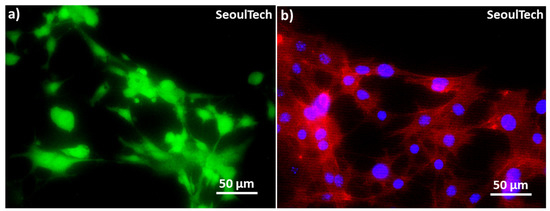 For the in vitro cell culture experiments, 3D bioprinted samples were prepared using the MC3T3-E1 cells (3 million/mL, passage 13). The cells were cultured in α-Minimum essential media (MEM) supplemented with 10% fetal bovine serum and penicillin-streptomycin (100 units/mL) and maintained in a 37 °C incubator with 5% CO2. The in vitro cell culture study was conducted for a duration of 3 days, and observations were made on days 0 and 3. Live/dead staining was performed using the MAX-View™ Live/Dead Cell Staining Kit. This staining method employs fluorescent calcein-AM (green) to indicate intracellular esterase activity and red-fluorescent ethidium homodimer-1 to confirm the loss of plasma membrane integrity. Images of the live and dead cells were captured after the addition of 1.2 µL of 2 mM ethidium homodimer-1 (EthD-1) and 0.3 µL of 4 mM calcein AM to 600 µL of phosphate-buffered saline (PBS). Following the addition of these agents, the plate was incubated in darkness for 30 min. The live and dead cells were visualized using different filters on a fluorescence microscope (Leica DMLB, Wetzlar, Germany) and combined using LAS-X Leica Microsystems software. Additionally, samples were stained with DAPI (4′,6-diamidino-2-phenylindole) for the nucleus (blue) and rhodamine-phalloidin for F-actin (red) to observe cell growth and proliferation [28].