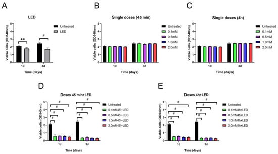 Analysis of cell viability in DOK cells, measured with the MTT assay after 1 day and 3 days the photodynamic protocol (ALAD-PDT). (A) Cells irradiated with LED alone compared to untreated cells; (B) cells incubated for 45 min with different concentrations (mM) of ALADENT; (C) cells incubated for 4 h with different concentrations (mM) of ALADENT; (D) cells incubated for 45 min with different concentrations (mM) of ALADENT and then irradiated with LED for 7 min; (E) cells incubated for 4 h with different concentrations (mM) of ALADENT and then irradiated with LED for 7 min. Data are presented as mean ± SD; n = 6. ** p < 0.01, # p < 0.0001.