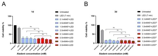 Analysis of cell viability in DOK cells expressed in percentage. The 45 min groups were individually compared with 4 h groups. Data are presented as mean ± SD; n = 6. ns = 45 min group (light blue bars vs. 4 h group (red bars) indicates non-significative result. (A) 1d and (B) 3d.