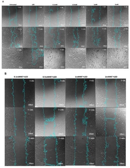 Cells were seeded in a 24-well plate at a concentration of 1 × 105 cells/well and left until they reached 80% confluence. A scratch was conducted with a 200 μL sterile pipette tip. Detached cells were washed away with PBS (1×). Cells were then treated as protocol. At each time point (0 h, 24 h, 48 h), the plate was placed under a phase-contrast microscope to observe the migration rate. The selected regions of interest were observed using an inverted microscope on a 10× objective (Primovert Zeiss, Berlin, Germany). To analyze the images using the Wound Healing Size Tool, an ImageJ software 1.48 version (NIH, Bethesda, MD, USA) plugin was used. It allows the quantification of wound area (μm2) in images obtained from a wound healing assay. The rate of cell migration (RM) was calculated according to Equation 2 as previously described []: