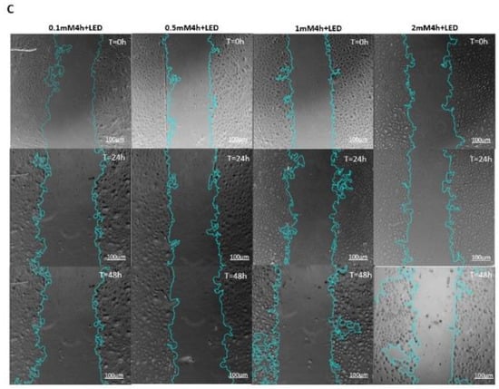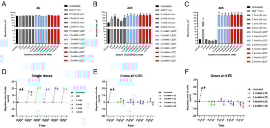 A wound healing assay was performed to verify whether the photodynamic treatment could decrease the metastatic potential of the tested precancerous cell lines, as shown in Figure 3. None of the doses of ALAD exhibited any inhibitory effect on the migration rate of DOK cells, and during the experiment, the cell-free area progressively diminished. In the cells treated with ALAD without light, wound closure began after 24 h, and complete closure occurred after 48 h of cultivation, as was observed in the control cells. LED alone was able to partially inhibit the closure of the wound (Figure 3A). Previous studies have shown the opposite effects of irradiation with LED or laser on promoting or inhibiting cellular migration, depending on the experimental settings, i.e., dosimetric parameters such as wavelength, energy, and irradiation frequency [,]. Based on the dose–response relationship between phototreatment and cancer cells, Schalch et al. found that oral squamous cell carcinoma irradiated with a 660 nm laser (40 mW; 4 J/cm2) demonstrated greater wound closure capacity than cells irradiated with a 780 nm laser (70 mW; 4 J/cm2) [,]. On the contrary, Henriques et al. observed a greater invasion potential of oral squamous cell carcinoma cells irradiated with a 660 nm laser using two energy densities (0.5 and 1.0 J/cm2) compared to the control group []. In our study, DOK cells’ migration rate was noticeably decreased after ALAD-PDT. ALAD-PDT significantly enhanced the width of the wound by enhancing the cell-free area (Figure 4). At 48 h post-treatment, the scratches appeared larger than the initial wounds (Figure 3B,C). Beyond the wound area, a reduction in attached cells was observed after 48 h of treatment with the highest dose of ALAD (2 mM), incubated for 4 h (Figure 3C). As illustrated in the graphs, the quantification of wound area (μm2) in time confirmed the ALAD-PDT protocol’s inhibitory effect (Figure 4A–C). The rate of cells moving towards the scratched area revealed that untreated cells and cells treated with ALAD alone migrated faster to close the gap of a scratch than LED-treated cells (Figure 4D). On the contrary, ALAD-PDT significantly reduced cell migration of DOK cells compared with untreated cells (Figure 4E,F). The greatest reduction in cell migration was observed in DOK cells incubated for 4 h with all doses of ALADENT plus light (Figure 4F).