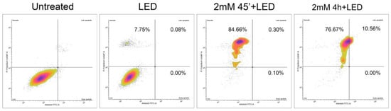 It is well known that PDT can lead to apoptosis, necrosis, and autophagy []. Double staining with Annexin V/PI was performed 24 h after treatment to assess the influence of ALAD-PDT on the death of DOK cells. Compared to the control group, a necrosis-inducing effect was observed in cells treated with 2 mM-ALAD combined with LED. As shown in Figure 6, the proportions of necrotic DOK cells were 84.66% and 76.67% after 45 min and 4 h, respectively. A small proportion of apoptotic cells (10.56%) was observed after 4 h of incubation with ALAD-PDT. LED irradiation alone induced a small number of necrotic cells compared to the control group. The results suggest that necrosis is the main type of cell death induced by ALAD-PDT. Even though necrosis is less observed than apoptosis in PDT studies, it was reported that the cell type, the subcellular localization of the photosensitizer, the type and site of generated ROS, and the light dose applied to activate the photosensitizer are factors and parameters determining which will be the fate of the cell, necrosis or apoptosis, following PDT [,,]. A recent study reported that 5-ALA-based photodynamic therapy can induce necrosis and apoptosis in pathologic proliferative skin cells []. Another study demonstrated singlet oxygen production after 5-ALA-PDT-induced RIP3-dependent necrotic pathway activation [].