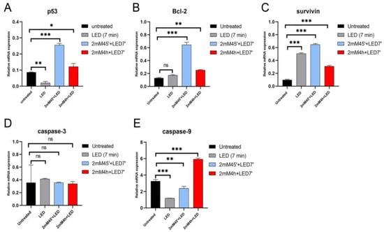 RT-PCR analysis evaluated the effect of ALAD-PDT treatment on (A) p53, (B) Bcl-2, (C) Survivin, (D) caspase-3, and (E) caspase-9, apoptotic-related markers in DOK cells. Data are presented as mean ± SD; n = 3. * p < 0.05 vs. untreated; ** p < 0.01 vs. untreated; *** p < 0.001 vs. untreated; ns—non significant.