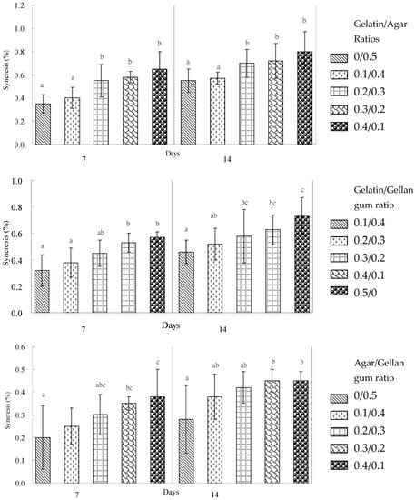 Syneresis of binary mixed gels stored at 4 °C for 7 days and 14 days. Data with different letters for each storage day represent significant differences at p < 0.05.
