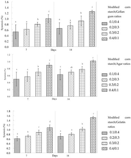Syneresis of modified corn starch and gum mixed gels stored at 4 °C for 7 days and 14 days. Data with different letters for each storage day represent significant differences at p < 0.05.