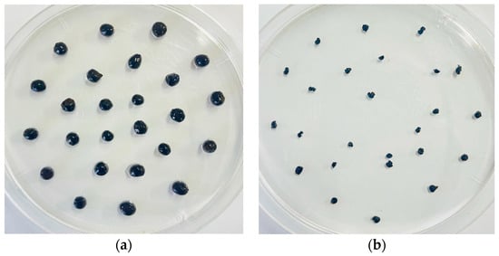 CMC-CS-Fe3O4 hydrogel beads. (a) Wet CMC-CS-Fe3O4 hydrogel beads; (b) CMC-CS-Fe3O4 hydrogel beads upon drying.