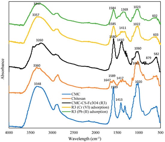FTIR spectra of CMC, chitosan, and CMC-CS-Fe3O4 before and after adsorption of Cr (VI) and Pb (II).