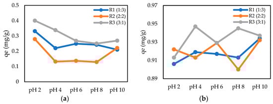 Ratio of CMC to CS at different pH values. (a) Adsorption of Cr (VI); (b) adsorption of Pb (II) (CMC-Cs-Fe3O4: 0.1 g, metal conc: 5 mg/L, volume: 20 mL, time: 60 min, and temperature: 30 °C).