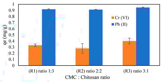 In this study, different ratios of CMC to CS were impregnated with magnetic iron oxide (Fe3O4) solution and tested in several pH ranges for the adsorption of Cr (VI) and Pb (II). The effects of different ratios of CMC and chitosan in this experiment were studied to have a better understanding of the adsorption capacity. According to the results shown in Figure 5, the ratios of CMC to chitosan influenced the structure of the hydrogel beads and the adsorption capacity of this hydrogel for heavy metals at certain pH levels. During the synthesis of CMC–chitosan, the amounts of CMC and chitosan used varied based on certain ratios. The ratios of 1:3, 2:2, and 3:1 were used in this experiment for CMC and chitosan values. In the synthesis of these hydrogel beads, the total weights of CMC and chitosan used were kept constant at 0.5 g in 20 mL of 1% acetic acid except that the weight ratio of these two adsorbents was modified. Figure 5 depicts the results for the effect of the CMC–chitosan ratio at different pH levels on Cr (VI) and Pb (II) adsorption. According to the graph shown, the R3 sample with a CMC:chitosan ratio of 3:1 obtained the highest adsorption capability for Cr (VI) and Pb (II) at pH levels of 2 and 4, respectively. As mentioned before, CMC content contributed to the water retention and adsorption ability owing to its structure, which is composed of many functional carboxyl (–COO) and hydroxyl (–OH) groups []. Therefore, the CMC content allows for the formation of balanced crosslinks with the amino group in the chitosan structure. The lower adsorption capacity observed in the R1 and R2 samples may be due to the increasing ionic bonding between CMC and chitosan, which restricts the binding sites available for adsorbing metal ions. Therefore, the highest adsorption capacity observed in the R3 sample with a CMC:chitosan ratio of 3:1, as shown in Figure 6, was used for further analysis to study the effects of different parameters on the adsorption of Cr (VI) and Pb (II).