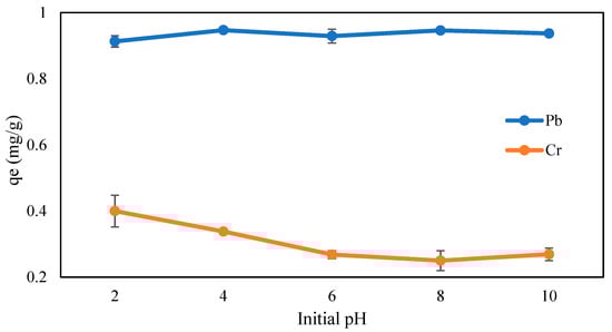 The pH of metal solutions is one of the most important factors strongly influencing the interactions between metals and the adsorbent []. Different pH levels will affect the surface’s interaction between the adsorbent and the adsorbate. Therefore, evaluations of the optimum pH conditions for the adsorption process were conducted to understand the mechanisms. For this experiment, 5 mg/L of Cr (VI) and Pb (II) solutions with different pH ranges from 2 to 10 were tested with a constant weight of CMC-CS-Fe3O4 (0.10 g) for 60 min.