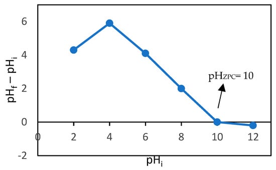 Cr (VI) at a pH of 2 exists in the form of Cr2O72− and HCrO4−, which are negative ions []. The pHzpc of the CMC-CS-Fe3O4 hydrogel beads was determined to obtain information regarding the pH value at which the charge of adsorbent’s surface is equal to zero. Determination of the zero-point charge is important to properly understand the adsorbent’s surface charge at a certain pH. Based on Figure 8, the pHZPC of CMC-CS-Fe3O4 hydrogel beads was discovered to be 10. At a pH less than 10, the surface of adsorbent becomes positively charged and more prone to protonation []. Hence, the negative ions of chromium (Cr2O72−/HCrO4−) existing at a pH of 2 favor the interaction forces with positively charged amino groups in CMC-CS-Fe3O4 and are capable of removing the heavy metal from aqueous solutions. The surface of the adsorbent, which is positively charged, is able to form electrostatic interactions with the Cr (VI) ions [] and therefore results in higher adsorption capacity and a greater removal percentage of chromium.