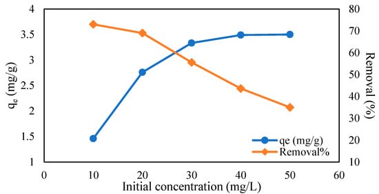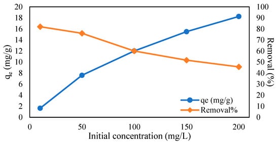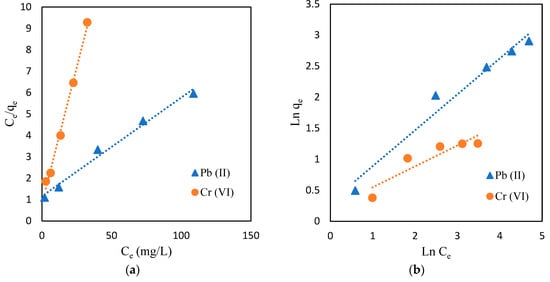 The initial metal concentration is certainly a significant parameter that affects the heavy metal adsorption capacity []. In this research, the adsorption isotherms are presented to represent the correlation between the number of metal ions adsorbed into the adsorbent and the concentrations of metal solutions after reaching equilibrium.