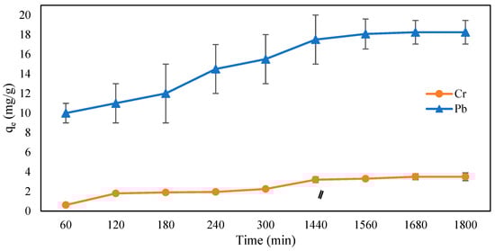 In an attempt to properly understand the influences of time and adsorption kinetics of Cr (VI) and Pb (II) by CMC-CS-Fe3O4 hydrogel beads, an adsorption experiment was conducted for certain period of times (60–1800 min) to investigate the effect of contact time on adsorption capacity. As shown Figure 12, the adsorption capacity increased at the initial stage from 60 to 300 min and started to slow until reaching equilibrium at 1680 min. The rapid adsorption in the initial stage was attributed to the availability of functional groups of CMC-CS-Fe3O4, leading to interaction between the Cr (VI) ions and Pb (II) ions with the CMC-CS-Fe3O4 surfaces. The adsorption process gradually slowed as the metal ions occupied the active site of CMC-CS-Fe3O4 until it finally reached equilibrium adsorption capacity of 3.5 and 18.26 mg/g for Cr (VI) and Pb (II), respectively.