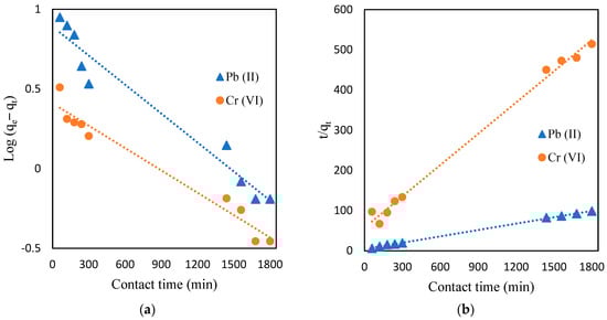 Adsorption kinetic studies. (a) Pseudo-first order; (b) pseudo-second order (CMC-Cs-Fe3O4 dosage: 0.1 g, volume: 20 mL, concentration: 50 mg/L at pH 2 for Cr (VI), 200 mg/L at pH 4 for Pb (II), and temperature: 30 °C).