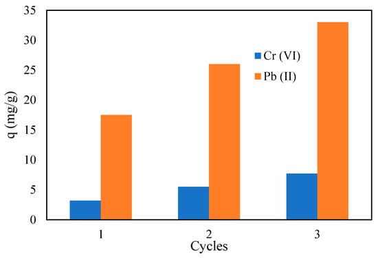 Adsorption capacity of CMC-Cs-Fe3O4 after several regeneration cycles. (CMC-Cs-Fe3O4 dosage: 0.1 g, volume: 20 mL, concentration: 50 mg/L at pH 2 for Cr (VI), 200 mg/L at pH 4 for Pb (II), time: 1440 min, and temperature: 30 ).
