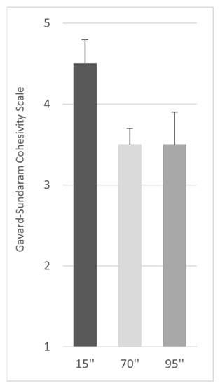 The cohesivity was evaluated independently by four raters that assigned, for each sample at each time point, a value of cohesivity (from 1 to 5), referring to the Gavard–Sundaram Cohesivity Scale, where 1 means fully dispersed, and 5 means fully cohesive []. The results were reported as the mean score ± SD.