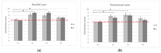 The US skin thickness determination (mm) using a parallel (a) or transversal (b) scan in both the right and left side. The measurements were taken before treatment (T1), 30 days after the first treatment and during the second treatment (T2), and three (T3) and six (T4) months after the beginning of the treatment. The red dashed lines indicate the baseline measurement media, and the statistically relevant differences are reported (* = p value < 0.05).